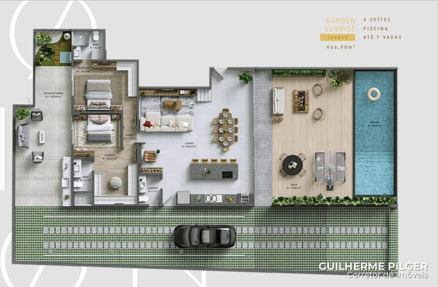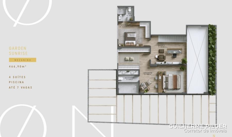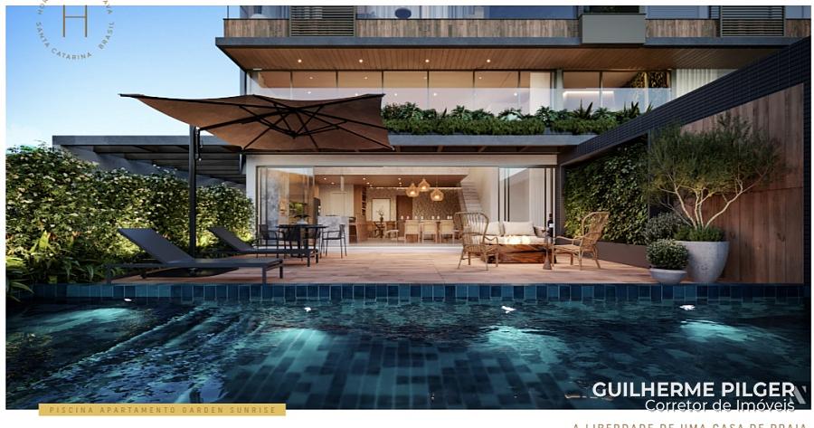 Apartamento garden do Edifício Horizon Luxury Residences na Praia Brava em Itajaí. Apartamento duplex com 466,90m² de área privativa, 04 suítes e 07 vagas de garagem com amplo espaço garden e piscina privativa.