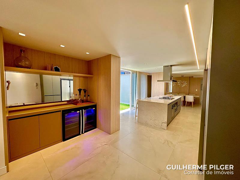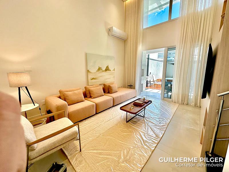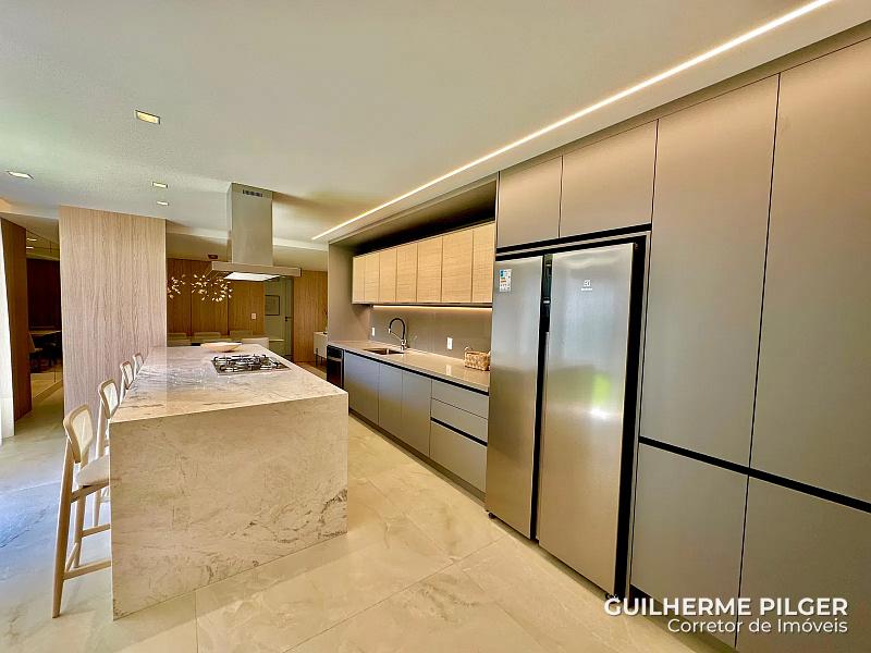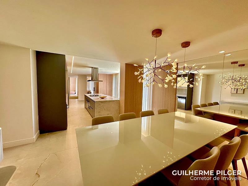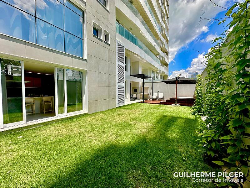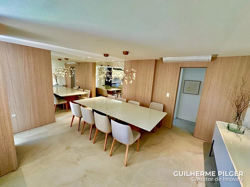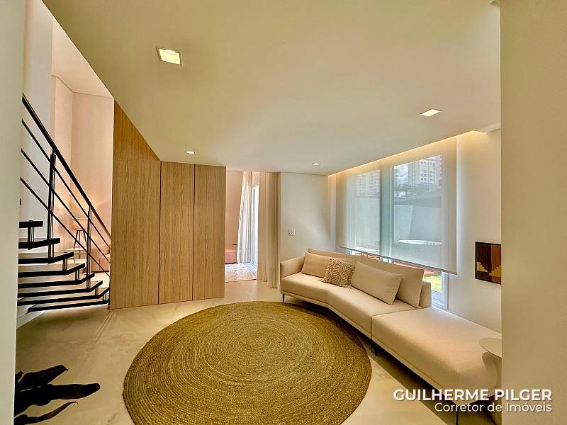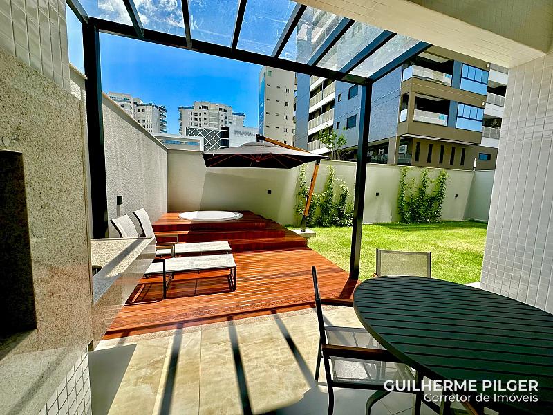 Apartamento garden duplex no Edifício Le Blanc localizado a 100m do mar da Praia Brava, com 295m², 2 pavimentos, 3 suítes e 3 vagas com um amplo jardim, possui jacuzzi e sala de TV com pé direito duplo.