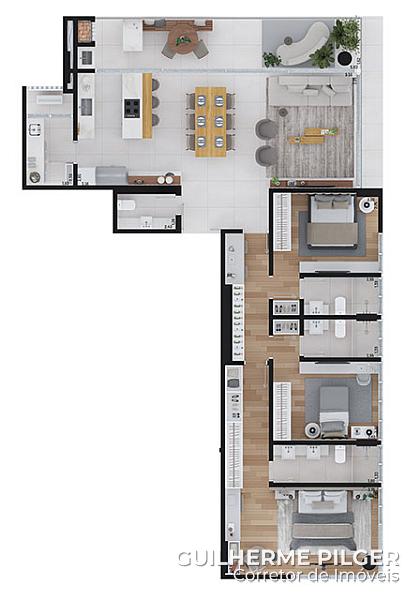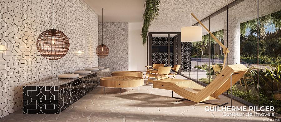 Apartamentos de 145m² e 148m², com 3 suítes, sala com grande área envidraçada, esquadrias piso ao teto, cozinha gourmet integrada, ampla sacada com churrasqueira à carvão, suíte principal com grande espaço para armários/closet, home office, rouparia e área de serviço.
