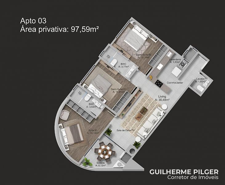 • Tipo 3: 100,29m² (1suíte+2demi)