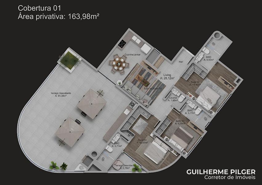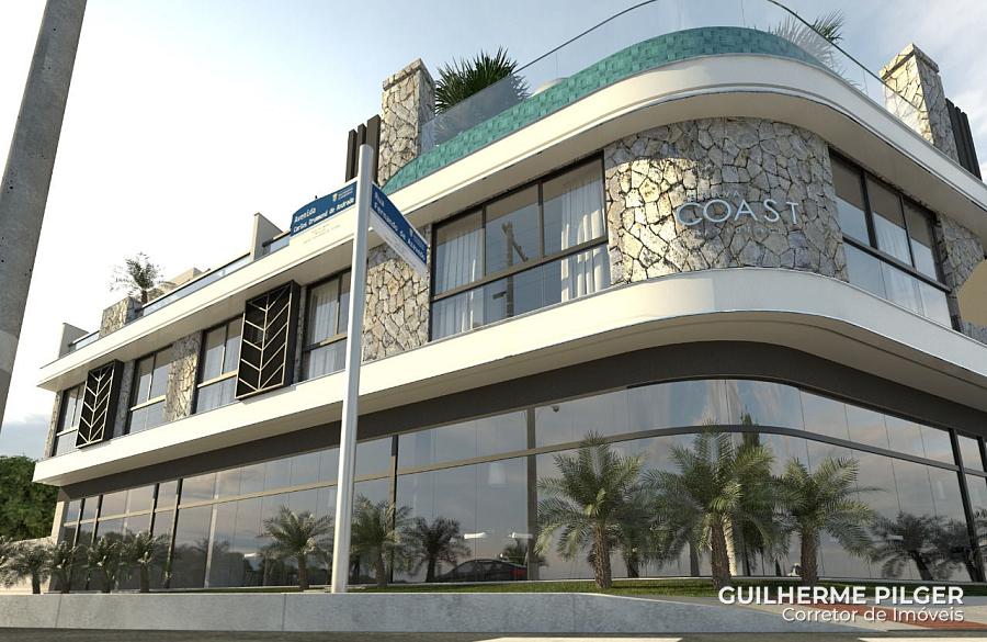 Cobertura no Edifício Brava Coast Residence na Praia Brava em Itajaí, com 166m² privativos, amplo terraço com churrasqueira, living com sala de estar e sala de jantar, cozinha, 3 suítes, lavabo, área de serviço e 3 vagas de garagem