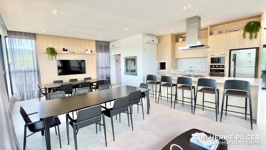 O imóvel possui 136 m² privativos e se distribui em duas grandes suítes com banheira de imersão, em ambas, e ambiente social totalmente integrado contendo cozinha, área de serviço, bar com adega climatizada de 33 garrafas, living, sacada fechada em reiki e churrasqueira a carvão, lavabo e 2 vagas livres no G1 em frente ao elevador.