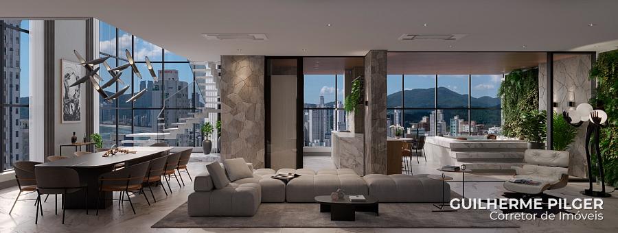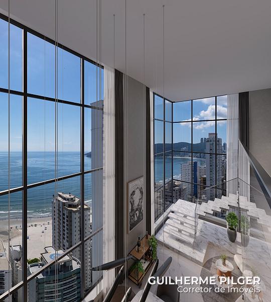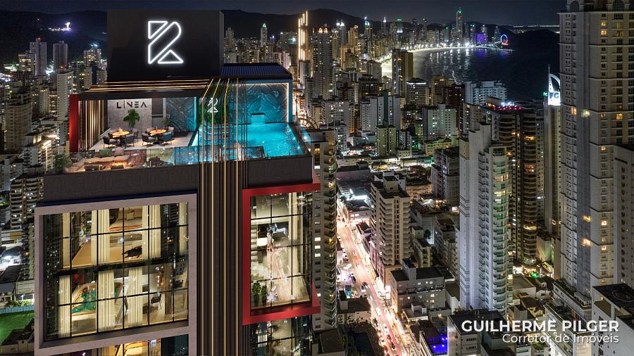 Apartamento Duplex no Ed. Linea em Balneário Camboriú possui 350,23m², ampla sacada com churrasqueira à carvão e ofurô, living com pé direito duplo com sala de estar e sala de jantar, cozinha americana, 4 suítes sendo 1 máster com closet e banheiro duplo e piso aquecido, área de serviço e 4 vagas de garagem.