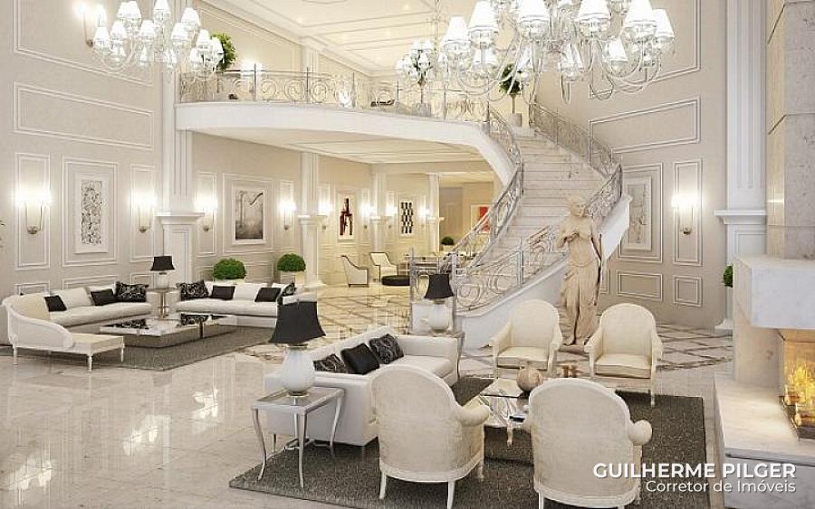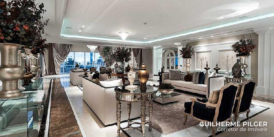 O apartamento mobiliado no Ed. Millennium Palace possui 316m² privativos, ampla sala de jantar e estar com ponto de lareira, piscina privativa com vista panorâmica para o mar com espaço gourmet grill e churrasqueira, pé direito alto, estar íntimo com 4 suítes com hidromassagem, sendo 1 master com closet, sala de banho e vista para o mar, área de serviço e 4 vagas de garagem.