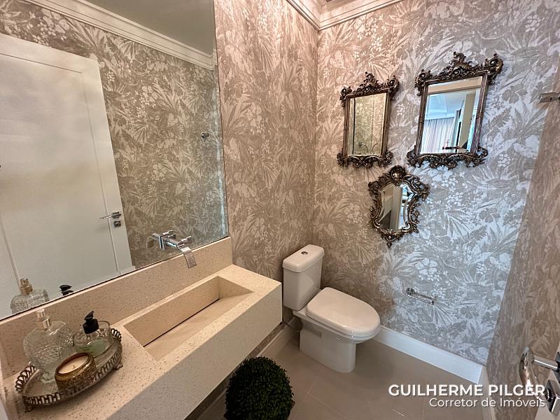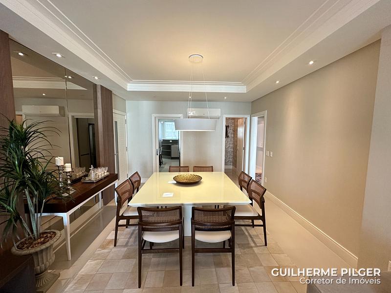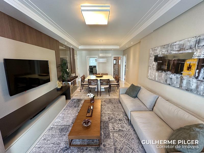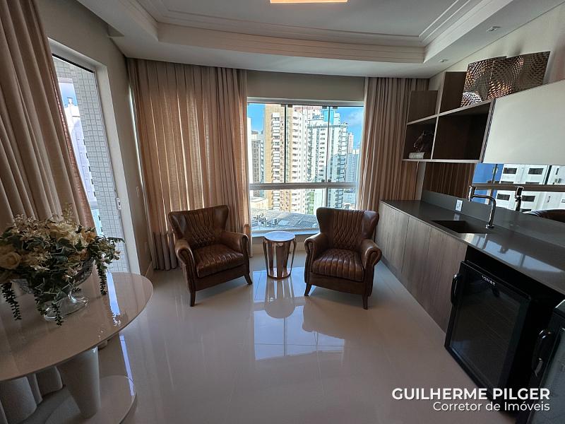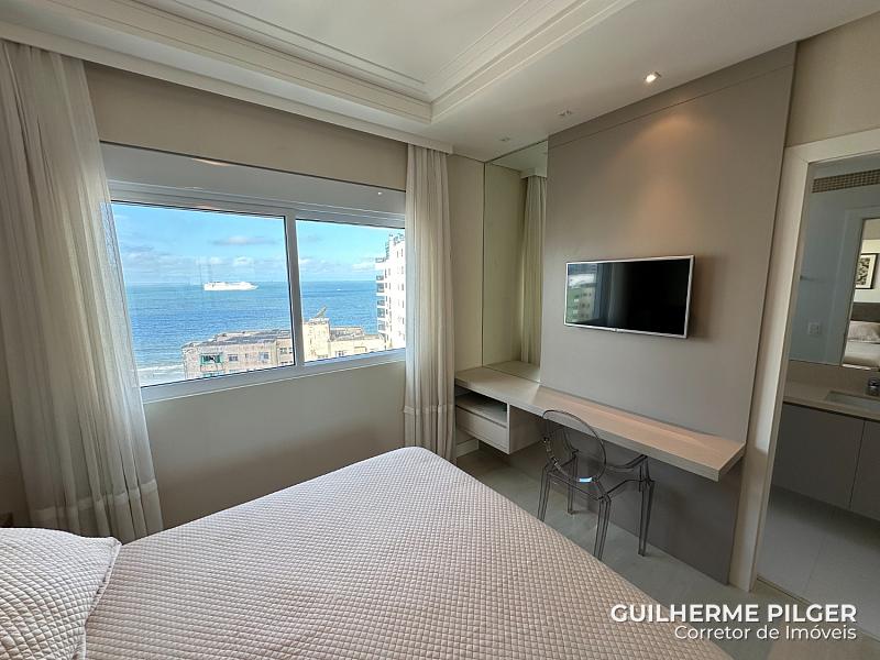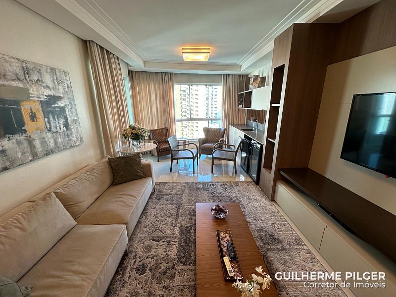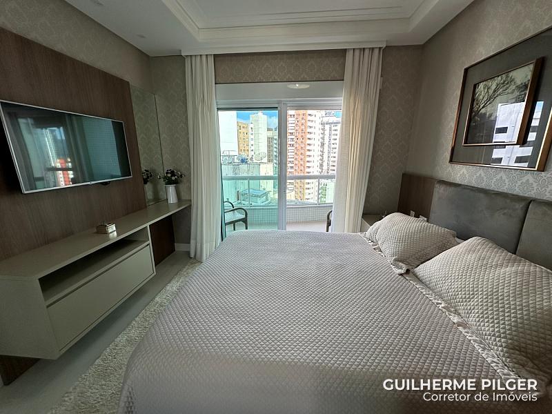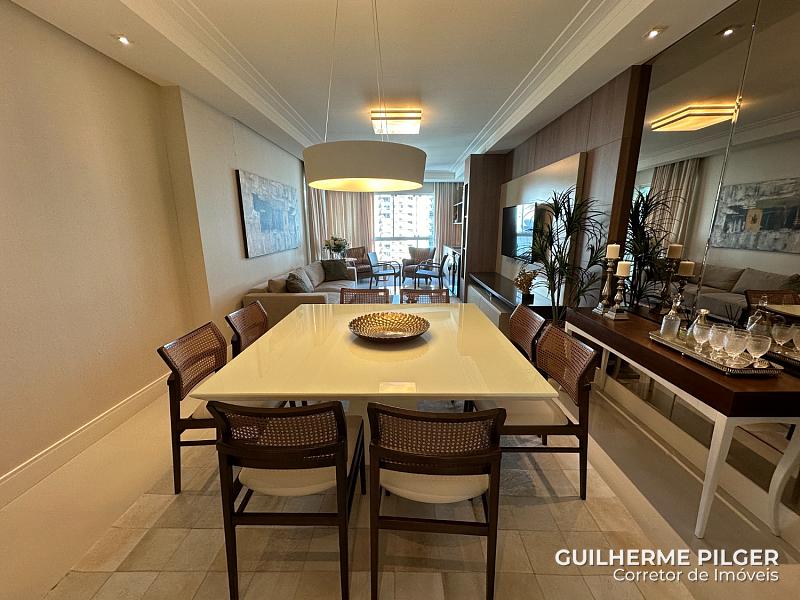 Apartamento no Edifício Vale dos Reis em Balneário Camboriú, com vista para o mar, 132m², 3 suítes, amplo living com sacada, sala de estar e jantar, espaço gourmet, lavabo, cozinha, área de serviço e 2 vagas de garagem.