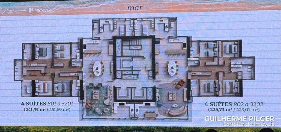 Os apartamentos variam de 225 m² para as unidades padrão e chegam a impressionantes 468 m², com 5 a 6 suítes, nas opções diferenciadas.