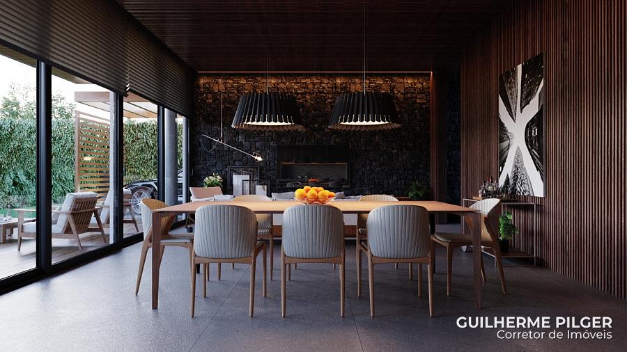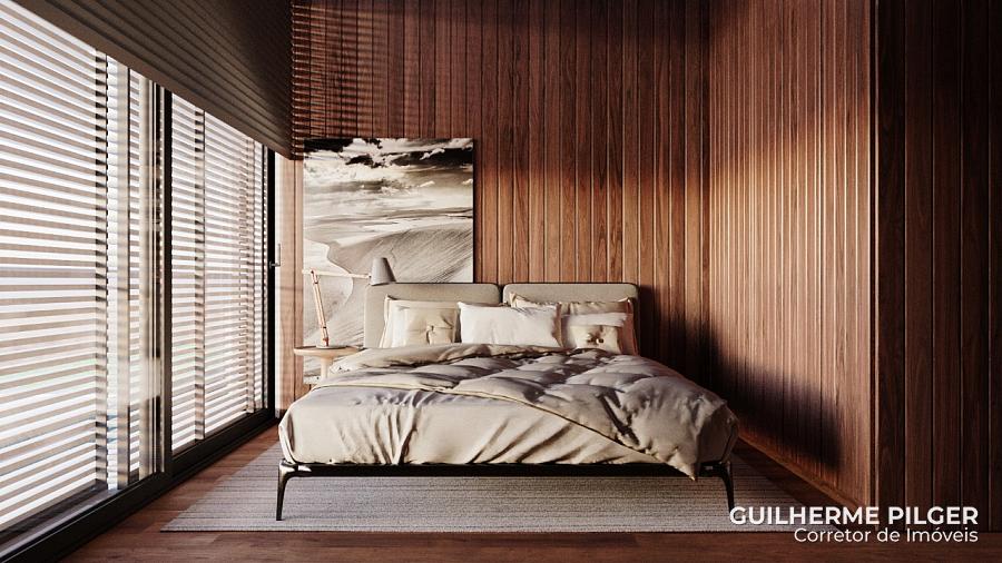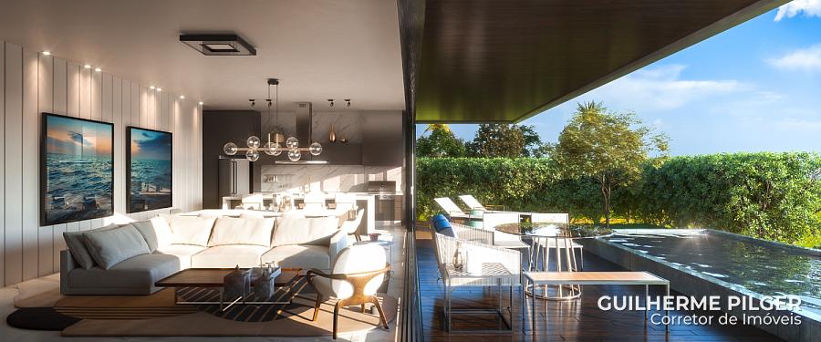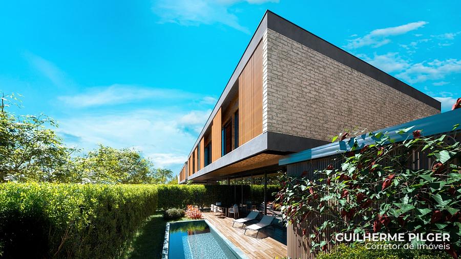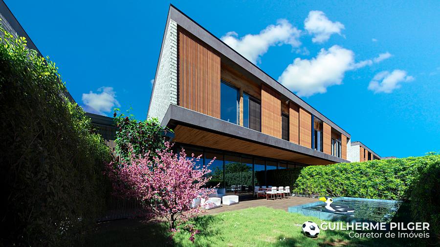 Casas com dois pavimentos, sendo no piso inferior um amplo living integrado com sala de estar, jantar e cozinha com churrasqueira a carvão, lavabo social, BWC, área de serviço, e um espaço externo com deck e piscina. No piso superior 04 suítes, sendo uma máster com 26,11 m².