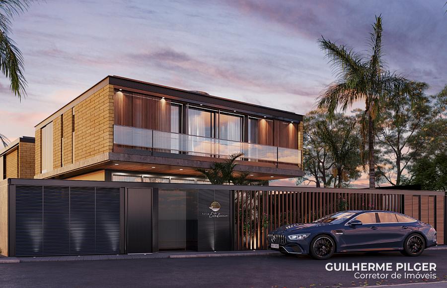 Casa com dois pavimentos, sendo no piso inferior um amplo living com sala de estar, jantar e cozinha com churrasqueira a carvão, adega, lavabo social, BWC e área de serviço, e um espaço externo com deck e piscina. No piso superior 04 suítes, sendo uma máster com 30,11 m².