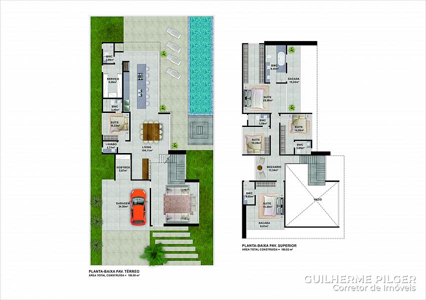 A casa possui 354,57m² de área construída, em um terreno de 360m², com arquitetura moderna e dois pavimentos, 05 suítes sendo 01 master com banheira, amplo living, sala de estar, sala de jantar, cozinha, churrasqueira, 1 lavabo, garagem para 02 carros cobertos e 02 descobertos, área de serviço, piscina, espaço fogo e jardim.