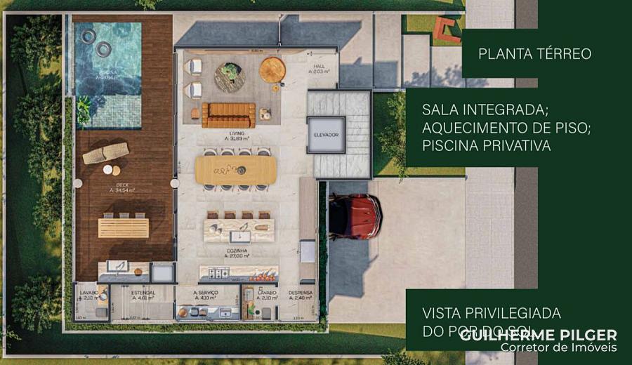 Casa no Colinas de Camboriú Village, com arquitetura contemporânea, 3 pavimentos, 392m², no pavimento superior 3 suítes sendo 1 master com banheira e closet, tendo possibilidade para 4 suítes, aquecimento de piso, e no piso inferior amplo living para sala de estar e jantar, cozinha americana, área de serviço e depósito, 1 lavabo interno e 1 lavabo para a piscina, espaço gourmet com churrasqueira e piscina, deck e prainha, 4 vagas cobertas de garagem no subsolo e depósito, espaço para elevador. A casa está localizada com vista privilegiada para o por do sol.