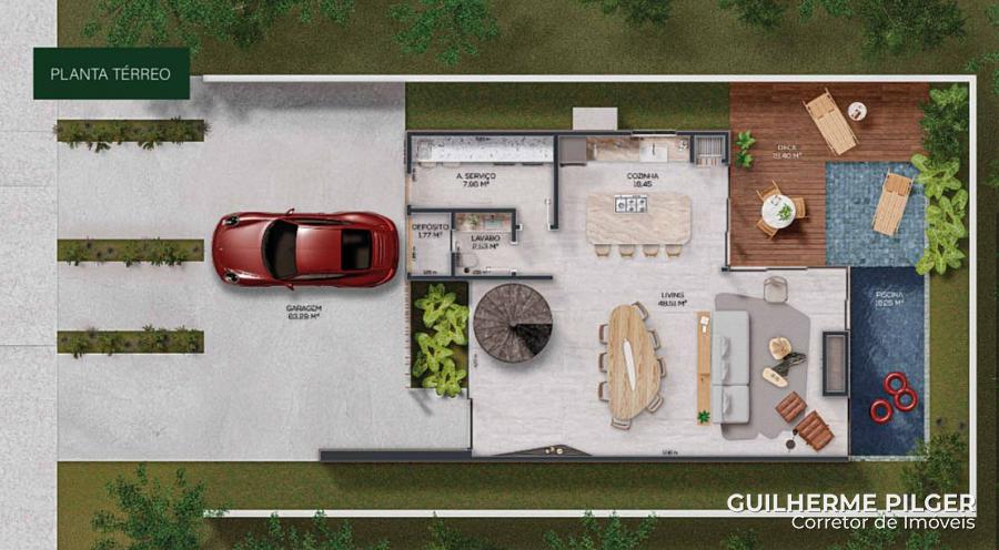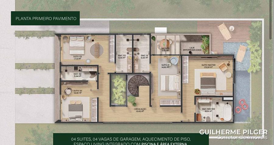 Casa no Colinas de Camboriú Village, com arquitetura contemporânea, 2 pavimentos, 350m², no pavimento superior 4 suítes sendo 1 master com banheira, aquecimento de piso, e no piso inferior amplo living para sala de estar e jantar, cozinha americana, área de serviço e depósito, espaço gourmet com piscina, deck e prainha, 3 vagas cobertas de garagem.