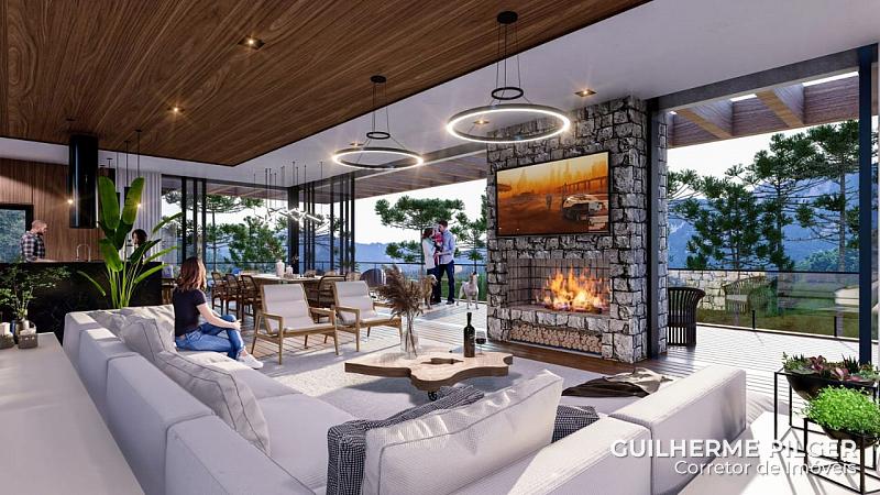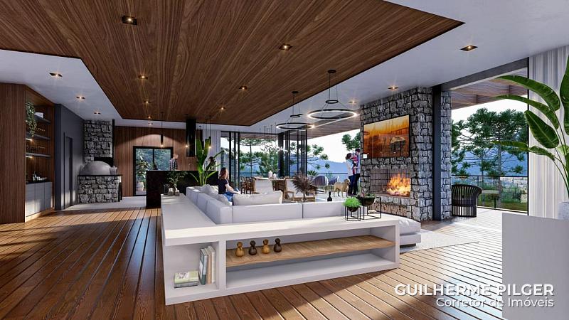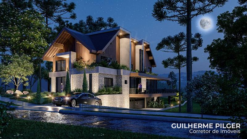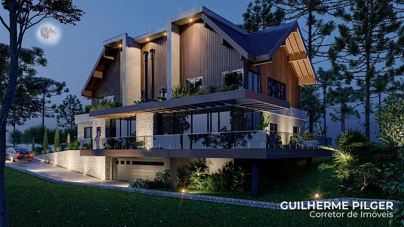 Das características gerais, essa casa em Gramado conta com 5 amplas suítes, living integrado com parte social, lareira e deck externo com vista para o vale.